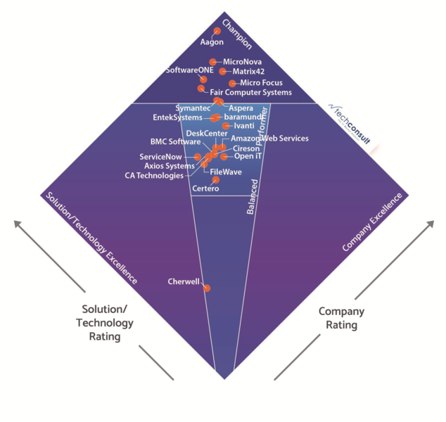 Das Ergebnis der umfangreichen Befragung stellt techconsult in Form eines „Diamanten“ dar, in dem die einzelnen Anbieter entsprechend ihrer Bewertungen positioniert sind. ACMP von Aagon belegt in sämtlichen Fragestellungen die Spitzenplätze und geht in den Bereichen Software Asset & License Management sowie Client Lifecycle Management eindeutig als Gewinner hervor.