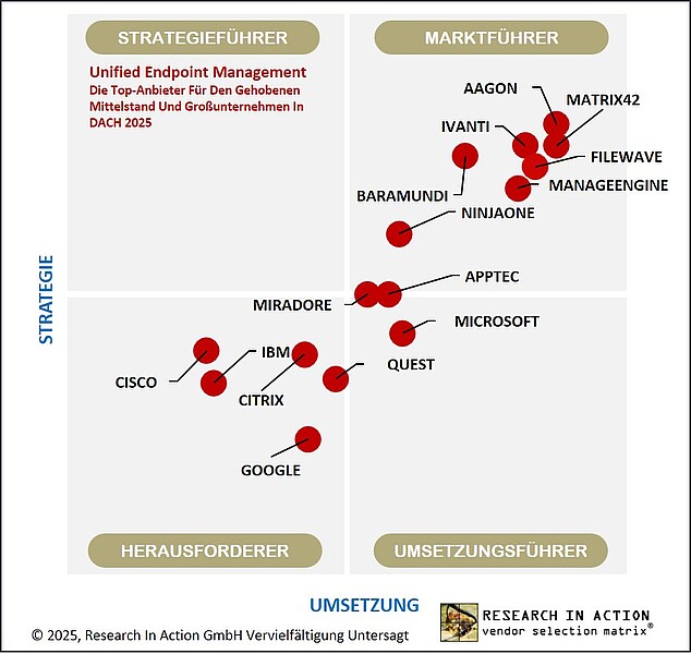Soest, 10. Dezember 2025: Besser geht’s kaum: Die aktuelle Marktstudie „Vendor Selection Matrix – Unified Endpoint Management 2025“ von Research In Action (RIA) bestätigt: Aagon ist die Nummer eins unter den UEM-Anbietern für den gehobenen Mittelstand und Großunternehmen in der DACH-Region. Mit Bestnoten in Strategie und Umsetzung sowie höchstem Weiterempfehlungsindex überzeugt die Aagon Client Management Platform (ACMP) durch erstklassige Qualität, umfassende Sicherheit und ausgefeilte Automatisierung.