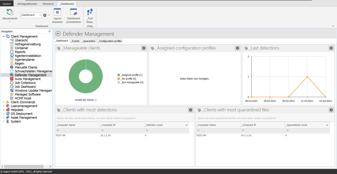 - ACMP Defender Management zeigt den Defender-Status, Scan-Historien, neueste Bedrohungen sowie Infos zum nächsten anstehenden Scan an. Zusätzlich bietet er die Möglichkeit zu Abfragen der genutzten und nicht genutzten Konfigurationsprofile.